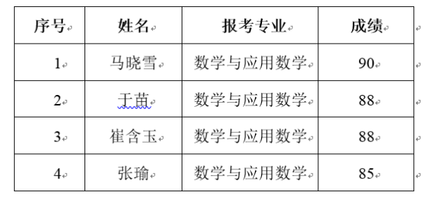 根据《吃瓜视频 2023年第二学士学位招生简章》及《2023年数学与应用数学专业第二学士学位招生考试方案》有关要求,学院对报名的4名学生进行初审并组织进行了考核,现将成绩公示如下: