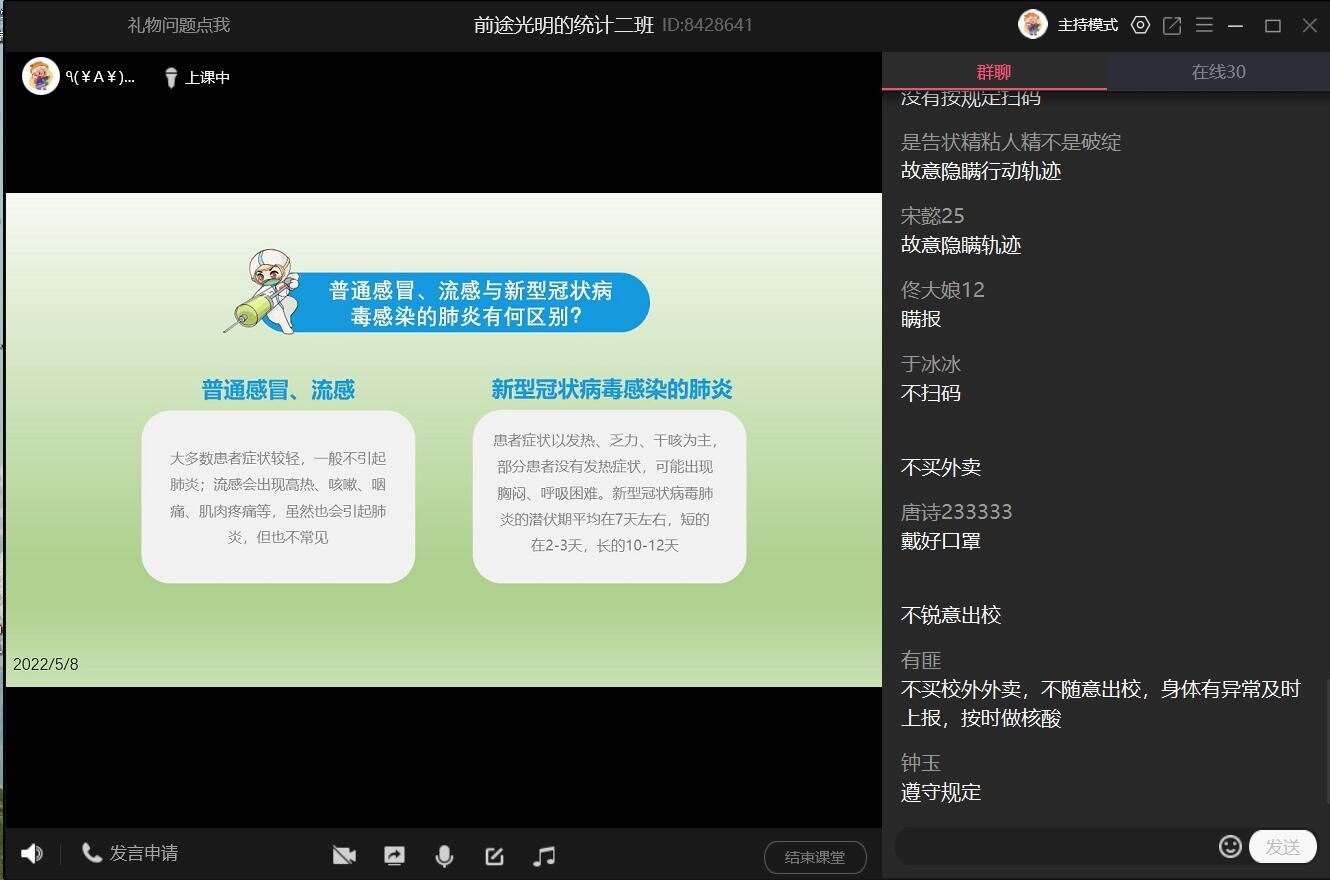 此次网络主题班会依托腾讯会议开展,各年级导师班主任采用直播课、交流会、主题讨论会、观看网络安全教育宣传片等形式,从爱国主义、责任担当、防疫知识、生命教育、就业教育、自主学习、实践教育等多个方面对全体学生进行教育和引导。一些班级还结合近期学习习近平总书记关于疫情防控工作的重要批示指示和讲话精神,通过图片、具体事例等深入浅出地让同学们认识到在全国疫情防控大背景下增强民族自豪感和自信心、按照学校安排完成各项工作的重要性。