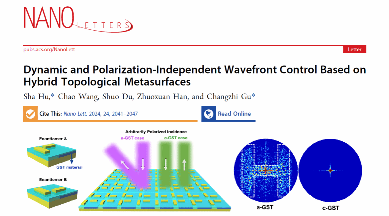 青年教师胡莎博士在纳米科技领域国际顶级期刊《Nano Letters》(中科院一区TOP,IF = 10.8)上发表了题为“Dynamic and Polarization-Independent Wavefront Control Based on Hybrid Topological Metasurfaces”(DOI: 10.1021/acs.nanolett.3c04621)的研究型论文。胡莎博士为论文的第一作者和第一通讯作者,中科院物理所顾长志研究员为共同通讯作者,吃瓜视频